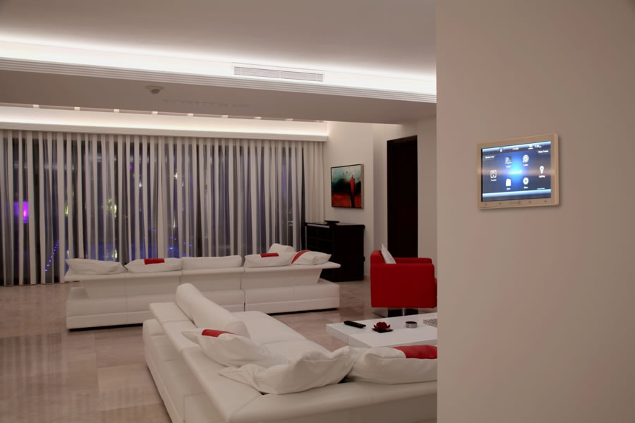 A state-of-the-art lighting control system to dim and change the colour of all RGB LED lights inside and outside the house, and the ability to search and queue the music library in readiness for parties.
